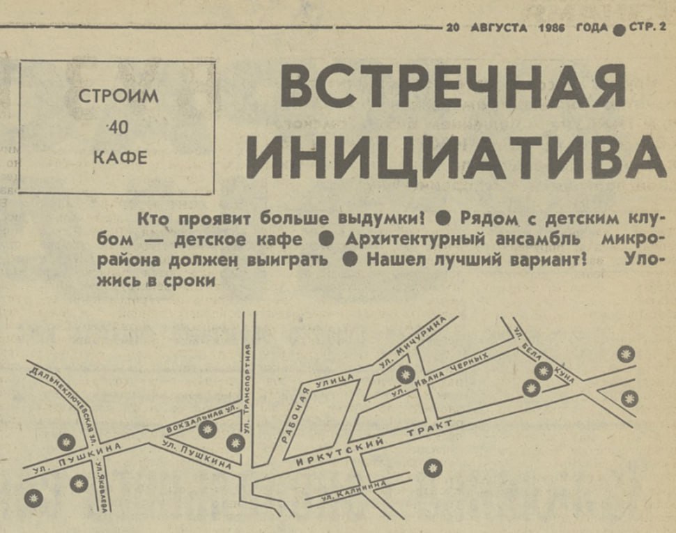 Красивое название инициативы «Строим 40 кафе» за собой скрывало и недостатки, и недосказанность. На самом деле никаких 40 кафе не было. Точнее, самих кафе — как таковых — было немного, а вот остальные из этих 40 были магазины «Кулинария» и «Домовые кухни» в разных районах города.