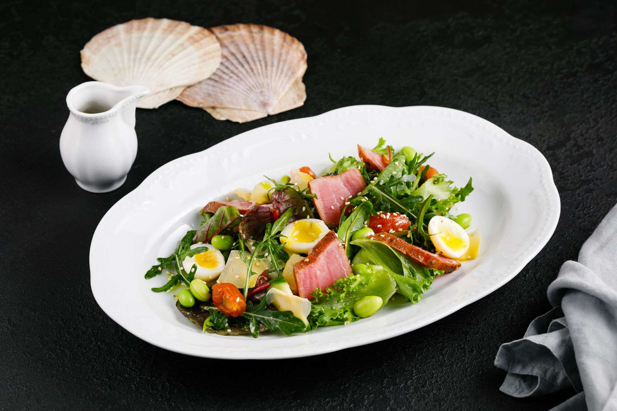 Среди тех морских блюд, что особенно вдохновляют гостей ресторана «Река 827», — классический салат «Нисуаз» в авторской подаче. В чем она заключается? В первую очередь, изменился подход к тунцу: