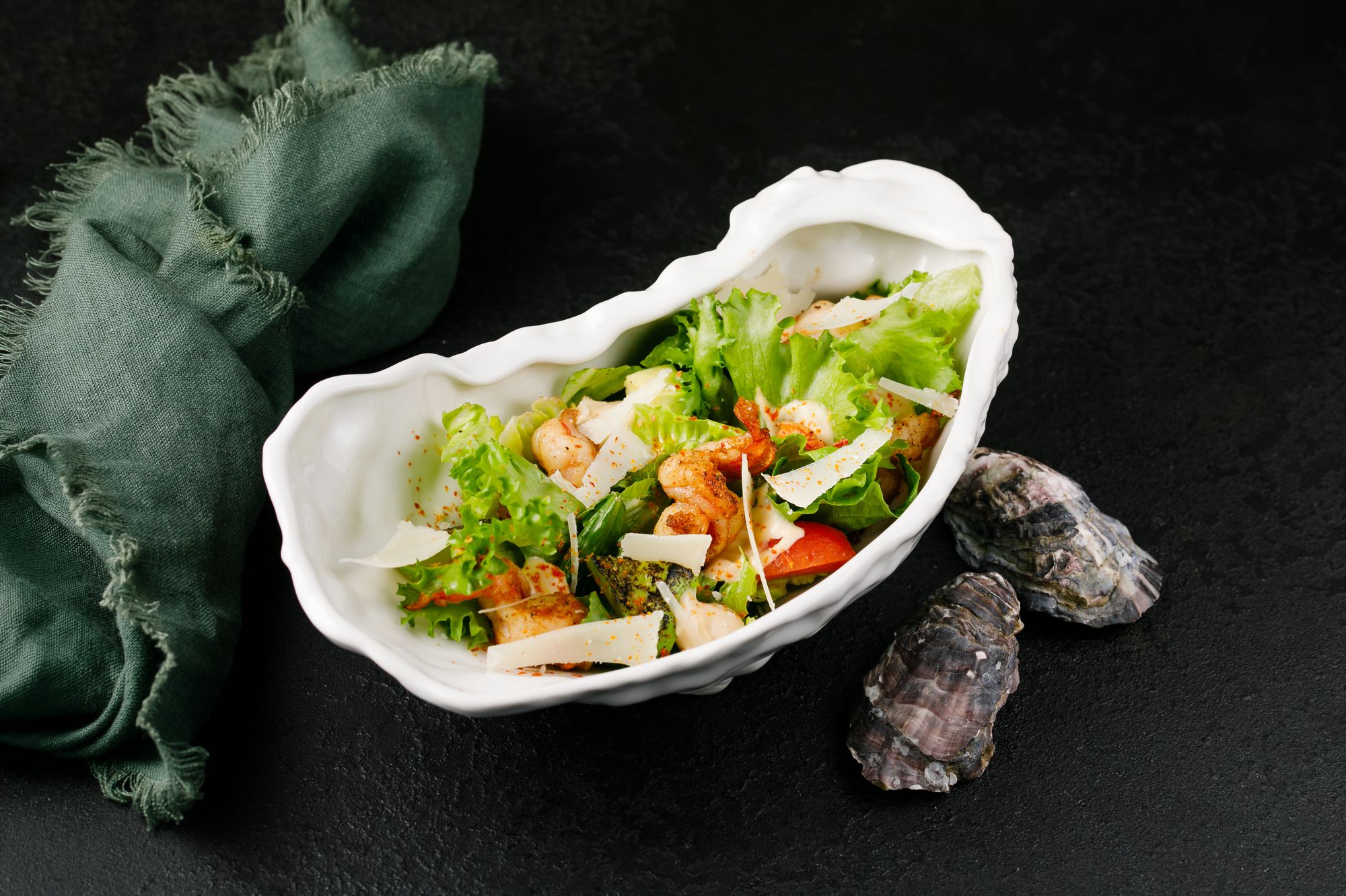 — Салат с креветками «выстрелил», а я его собрал буквально минут за пять! — признается шеф. — Понял, что надо обжарить для хруста креветку, добавить сыра, микс зелени, свежий помидор, придать авокадо дымные ноты... И получился салат, очень востребованный у гостей.