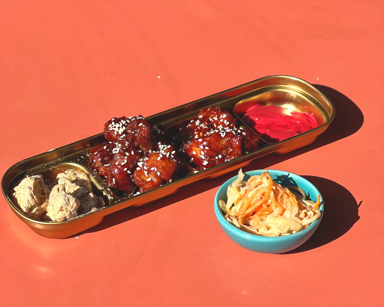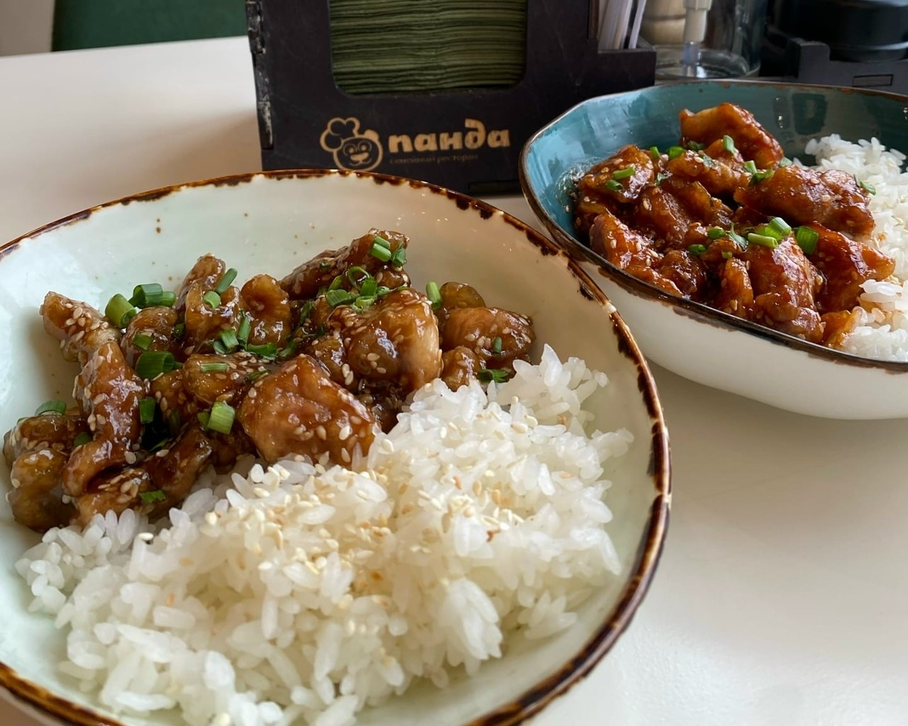 Горячее: Чикен в сладко-остром соусе подается белым дайконом и чесночным соусом / курица в панировке с соусом карри и рисом;