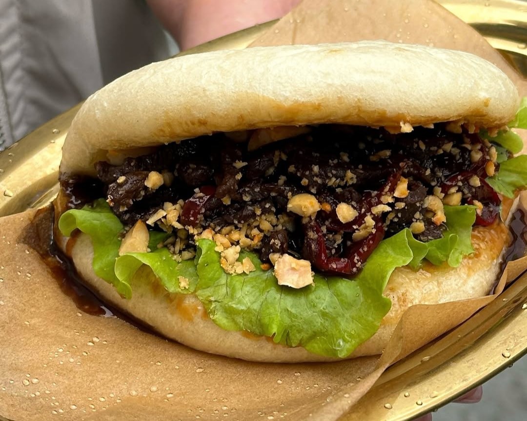 Бао: С рваной говядиной и овощами с соусом терияки и арахисом чили;