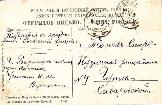 Семьянином тоже: мы знаем, что вместе с ним проживали Петр Николаевич Саваровский — ученик 21 года, а также дочь Августа, или как ее еще называли, Гутя. До нашего времени дошли два любопытных артефакта, связанных с ней: поздравительная открытка, отправленная Гуте из Барнаула от учителя Верещагина и книжка, которой владела девочка.