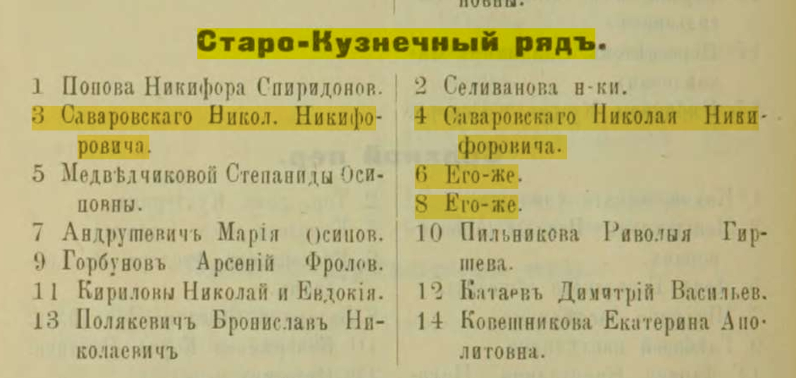 Согласно информации из «Списков улиц г. Томска с поименованием домовладельцев», в 1908 и 1915 гг. Николаю Никифоровичу в Кузнечном ряду принадлежали сразу несколько зданий — под номерами 3, 4, 6 и 8. Подтверждает то, что он владел домом №4, и список избирателей по городу Томску 1917 года (СНОСКА: составлен Н. М. Дмитриенко, А. Г. Караваевой и А. Д. Дементьевой). К тому времени Николаю Саваровскому было уже 60 лет, и можно предположить, что предпринимателем он был вполне успешным.