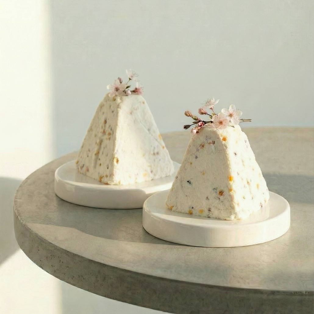 Есть три варианта творожной пасхи: классическая с изюмом и домашними апельсиновыми цукатами, она в форме зайчика, шоколадно-апельсиновая с шоколадным творогом, шоколадными каплями и домашними апельсиновыми цукатами, в форме шоколадного купола, фисташковая с клюквой, натуральной фисташковой пастой и кешью, в форме цилиндра на печеньке. Цена 550 рублей.
