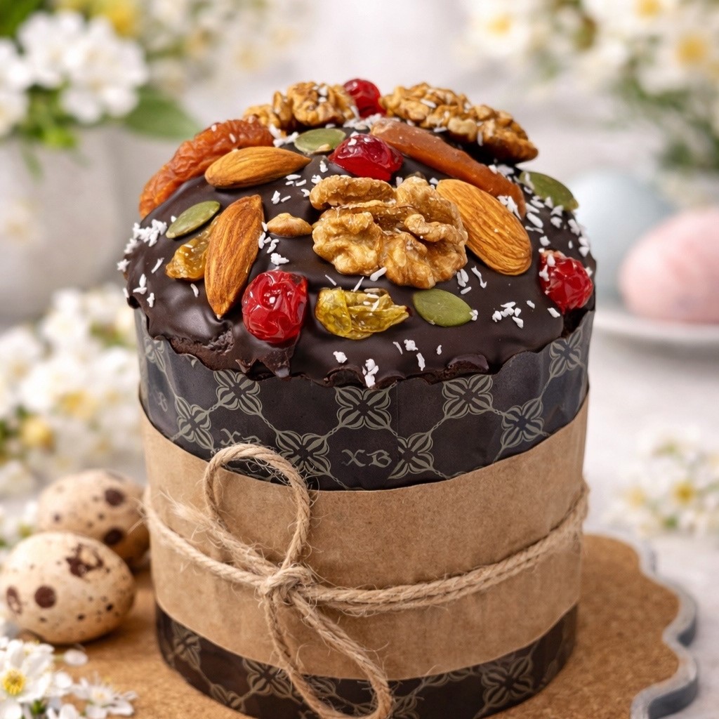 Пасху предлагают классическую, с курагой и грецким орехом и новинку — творожную с малиновым пюре, в шоколадном корпусе. Цена от 850 рублей.