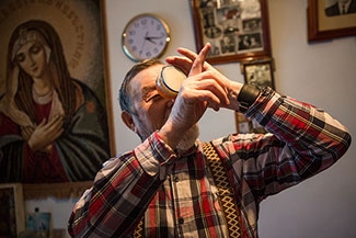 Георгий Арсентьевич разглядывает фотокарточку, на которой он на Красной площади — в модном драповом пальто и шляпе.