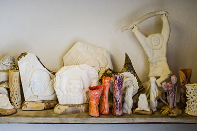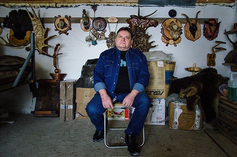 В просторном гараже все полки уставлены работами Юрия: мелкие зайцы и медвежата, абстрактные композиции, портреты по дереву и кости — все то, что он создавал за последние 15 лет.