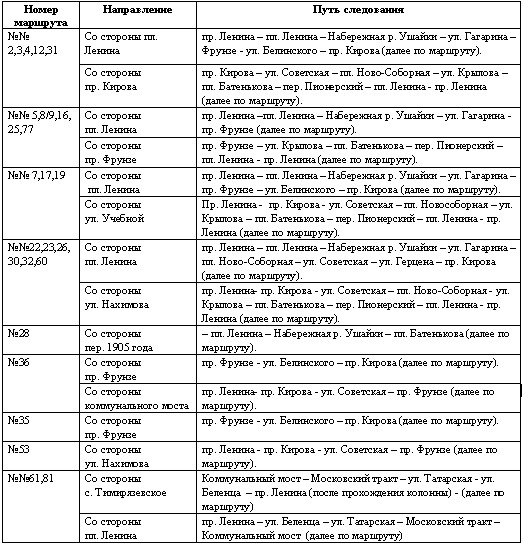В связи с этим движение пассажирского транспорта по проспекту Ленина будет закрыто с 18.30 до 21.00. Движение троллейбусов маршрутов №№ 1, 2, 3, 4, 6, 7, 8 на участке от площади Ленина в сторону проспекта Кирова будет отменено, а маршрутный транспорт будет направлен в объезд по следующей схеме: