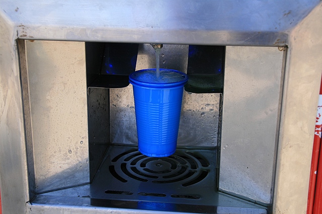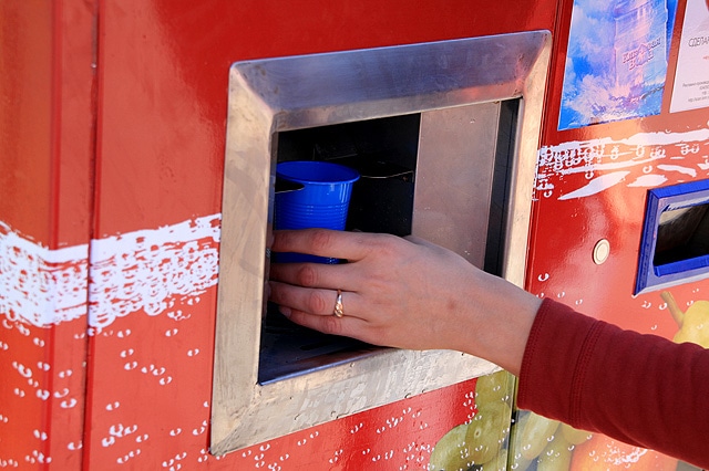 Для того чтобы совершить покупку, сначала необходимо выбрать напиток на табло, затем закинуть в автомат деньги и подождать. Через несколько секунд появится пластиковый стаканчик, в который нальется газировка.