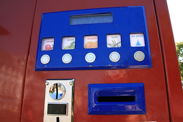 Купить в автомате можно пять видов напитков: с сиропом – "брусника", "яблоко", "апельсин", "тархун" и без сиропа – содовую. Цена, 10 и 5 рублей соответственно, принимаются как бумажные деньги, так и монетки.