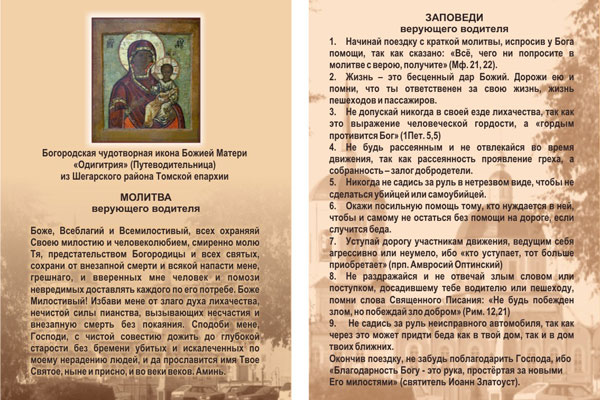 В заповедях, изданных в виде памятки, также содержится молитва водителя и изображение Богородской чудотворной иконы Божией матери "Одигитрия" (Путеводительница) из Шегарского района Томской епархии.