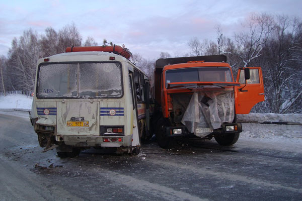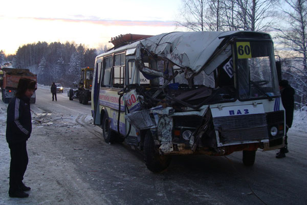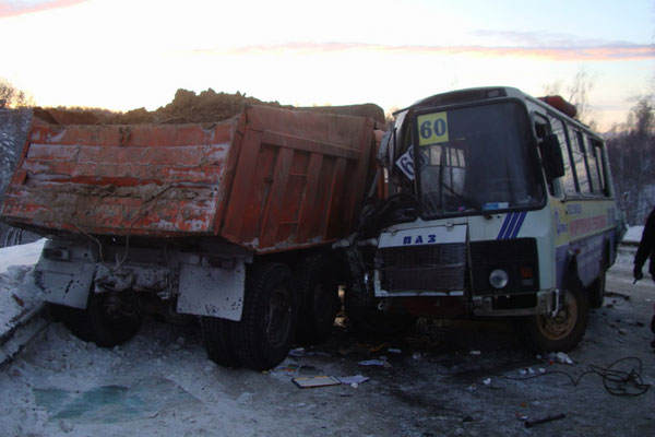 Водитель автомобиля КамАЗ не справился с управлением и выехал на полосу встречного движения, где столкнулся со встречным ПАЗом. Автобус с пассажирами двигался по маршруту № 60. После удара автобус откинуло на автогрейдер, стоящий на обочине. Травмы получили три пассажира "маршрутки".