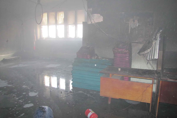 Сам пожар произошел в спортзале на 5 этаже (общая площадь спортзала примерно 50 кв.м). От огня пострадало подсобное помещение 3х4 метра, сам спортзал закоптился.