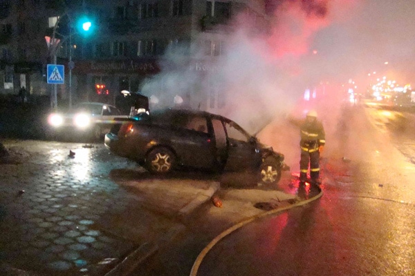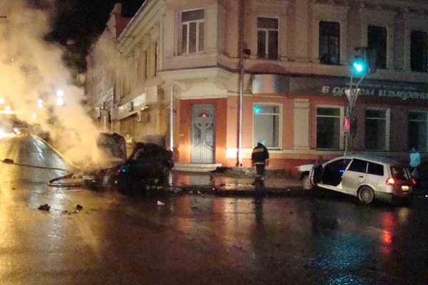 От удара автомобиль Chevrolet Lacetti загорелся. Из-за пожара движение по пр. Ленина было ограничено. Сотрудники ГИБДД осуществляли ручное регулирование движения.