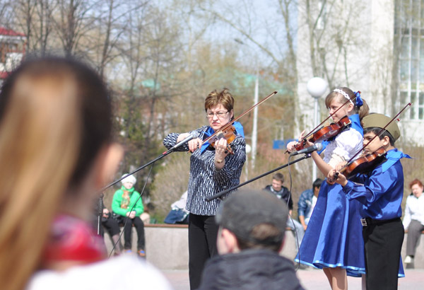 В субботу, 30 апреля, на площади Новособорной все желающие могли послушать концерт, в программе которого были мелодии военных лет и патриотические песни в исполнении учащихся Детской школы искусств №1 и Детской музыкальной школы №2:
