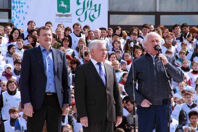 Продолжилось праздничное мероприятие на концертной площадке перед БКЗ, где на импровизированной сцене губернатор Томской области Виктор Кресс, мэр Томска Николай Николайчук и ректор ТПУ Петр Чубик торжественно открыли Центр подготовки волонтеров ХХII Олимпийский игр.