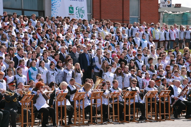В заключение хор "1000 голосов за Россию" в сопровождении сводного оркестра исполнил на площадке перед БКЗ гимн России.