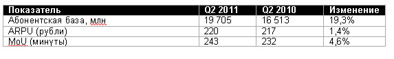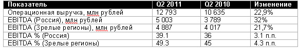 • показатель EBITDA в целом по России составил 5 млрд рублей, увеличившись на 32% в сравнении со вторым кварталом 2010 года;