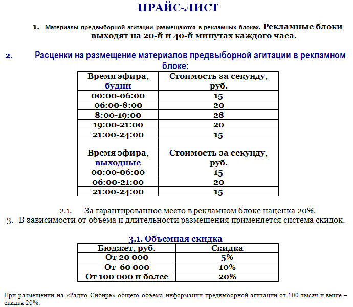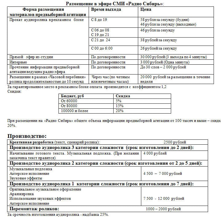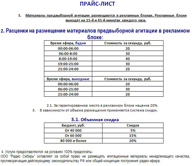 Радио Сибирь: Расценки на предвыборную агитацию