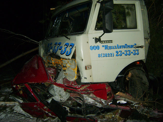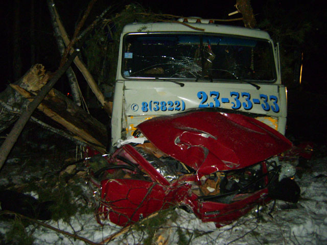 ДТП произошло во вторник, 27 декабря, около 6 утра на трассе Томск-Шегарка (около 50 км от Томска). По словам очевидцев, автомобиль "Жигули", двигающийся в направлении Томска, на летней резине боком "вошел" под грузовик. В результате легковушка и грузовик вылетели на обочину.