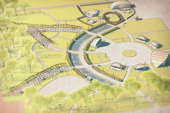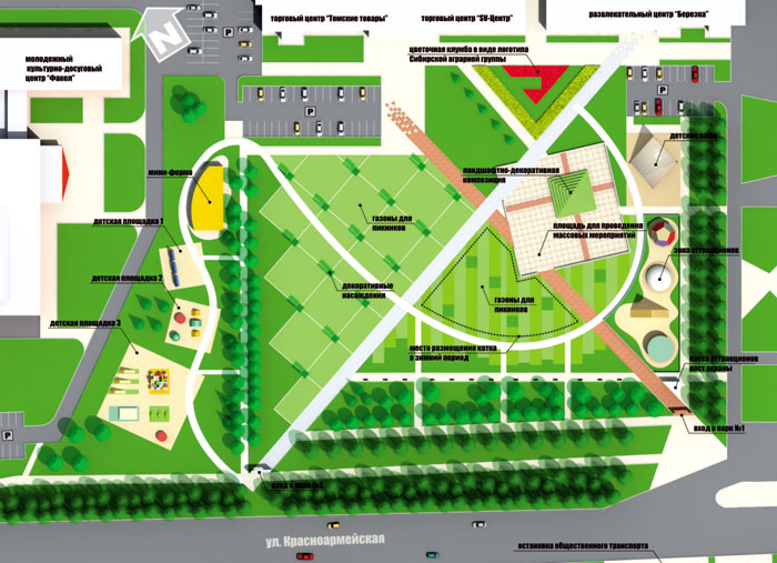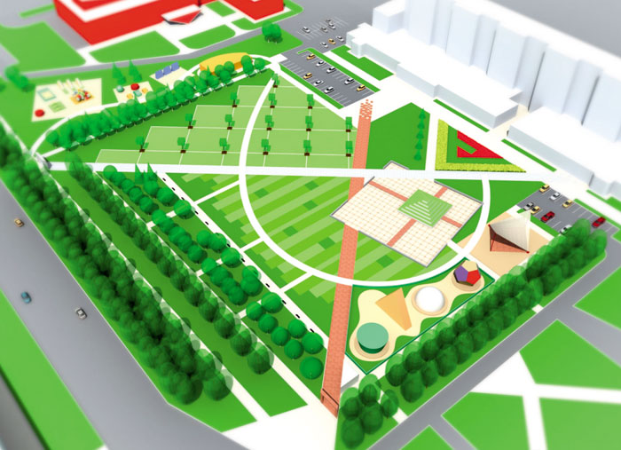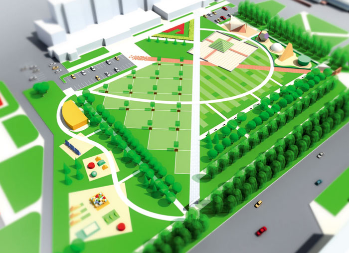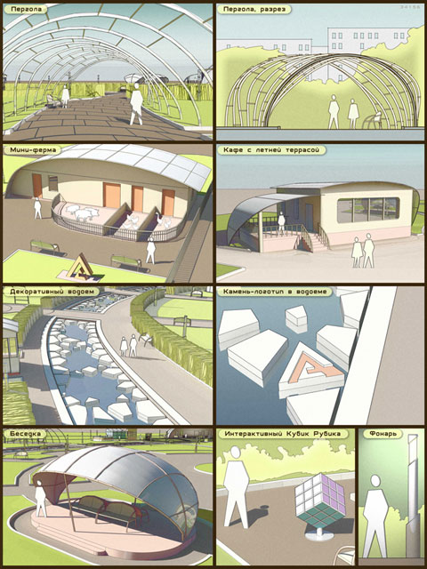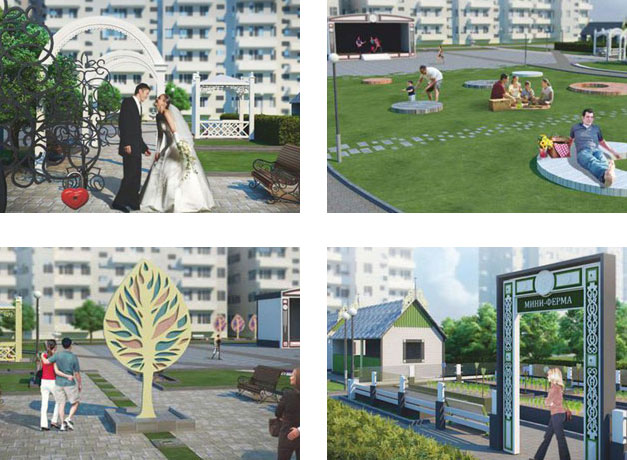 Вдоль основных пешеходных магистралей попроекту предполагается разместить перголы с лавочками, где можно укрыться от дождя и снега, а также беседки вокруг центральной площади. Здесь могут отдыхать горожане всех возрастов. Для малышей предполагается сформировать зону за счет размещения аттракционов и мини-фермы по соседству, что позволит облегчить вопрос охраны территории. Для молодежи организуется спортивная зона и театральная площадь. Старшему поколению предлагается удобная система прогулочных пешеходных дорожек и пикниковых лужаек.