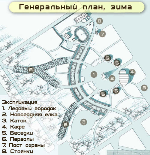 В летнее время в сквере можно разместить мини-ферму, детские аттракционы, спортивные площадки для катания на роликах и центральную площадь для проведения мероприятий. Зимой центральная площадь трансформируется в ледовый городок, а спортивная площадка — в каток. Детское кафе может работать в любое время года, так как имеет закрытое помещение и веранду.