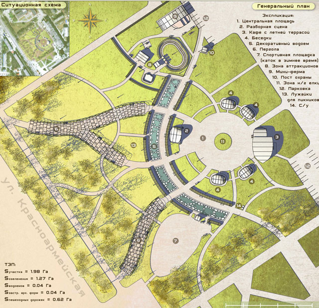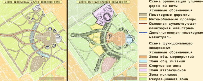 В проекте также предлагается сохранить основные диагональные пешеходные транзиты, изменив их линейность в соотвествии с авторским художественным замыслом. На территории может быть сформирован дополнительный пешеходный транзит, объеиняющий три основные площадки: детскую, центральную и спортивную. С одной стороны пешеходную дорожку огораживает ряд невысоких кустарников, с другой - линия искусственных водоемов. Транспортная доступность решена за счет автомобильных парковок и загрузочных пподъездов к детскому кафе и мини-ферме.