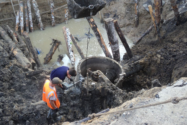Несколько часов ушло на откачку воды из котлована, затем были демонтированы бетонные кольца канализационного колодца – он находился в 20 см от поврежденного участка, на водовод установлена муфта. С 00.30 ночи специалисты предприятия начали постепенное заполнение водовода.