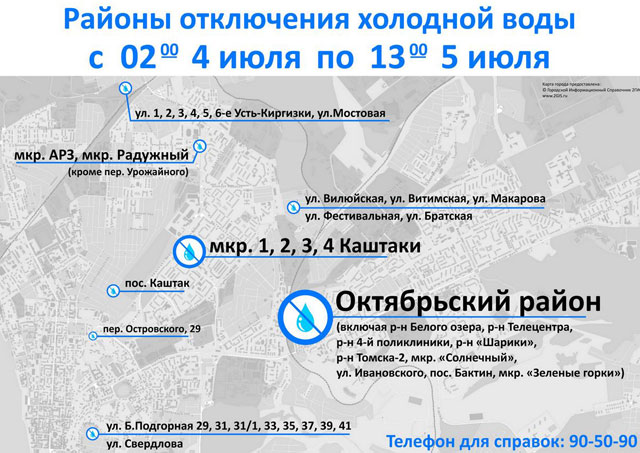 Так, в ночь на 4 июля бригады ООО «Томскводоканал» приступят к очередному этапу работ по переврезке водопроводных сетей. Весь комплекс работ займет 35 часов. На время их проведения с 2 часов ночи 4 июля до 13 часов четверга, 5 июля, холодная вода будет отсутствовать в Октябрьском районе и ряде микрорайонов Ленинского района.