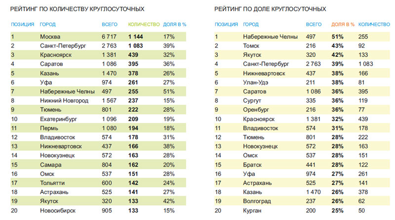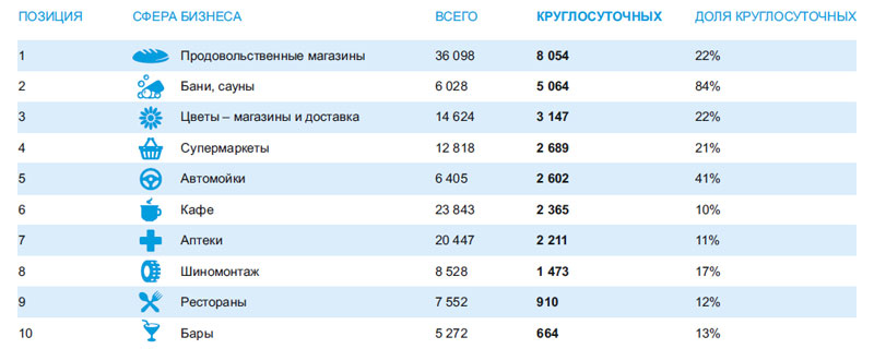 По данным исследования, больше всего круглосуточных предприятий в России среди продовольственных магазинов (свыше 8000 работают 24 часа в сутки), бань и саун (более 5000), салонов продажи и доставки цветов (более 3100). Также в десятку лидеров вошли супермаркеты, автомойки, кафе, аптеки, шиномонтаж, рестораны и бары. В рейтинге не учитывался бизнес, который априори функционирует круглосуточно (например, АЗС).