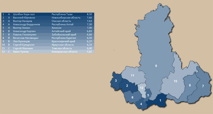Лидерами в своих федеральных округах (помимо перечисленных выше) стали губернатор Магаданской области Николай Дудов (ДФО), глава Кировской области Никита Белых (ПФО), глава Республики Тыва Шолбан Кара-оол (СФО), губернатор Курской области Александр Михайлов (ЦФО) и глава Адыгеи Аслан Тхакушинов (ЮФО).