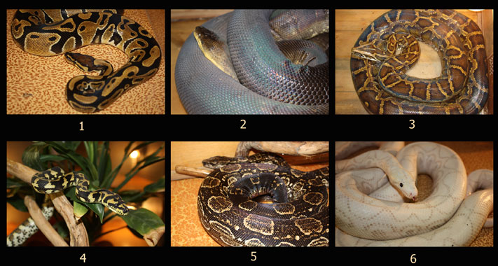 1 - Королевский питон (шаровой питон, питон-мяч), способный достигать до 1,5 в длину, в случае опасности может сворачиваться в тугой шар. 2 - Индонезийский водяной питон, обитающий по берегам рек, на болотах и заболоченных лугах. 3 - Тигровый питон, который проживает в зоопарке более 20 лет. 4 - Новогвинейский ковровый питон, получивший свое название из-за сходства рисунка на коже с рисунком персидского ковра. 5 - Аргентинский удав, обитающий в засушливых открытых ландшафтах. 6 - Бразильский радужный удав - уникальный в своем роде: после линьки приобрел светлую окраску