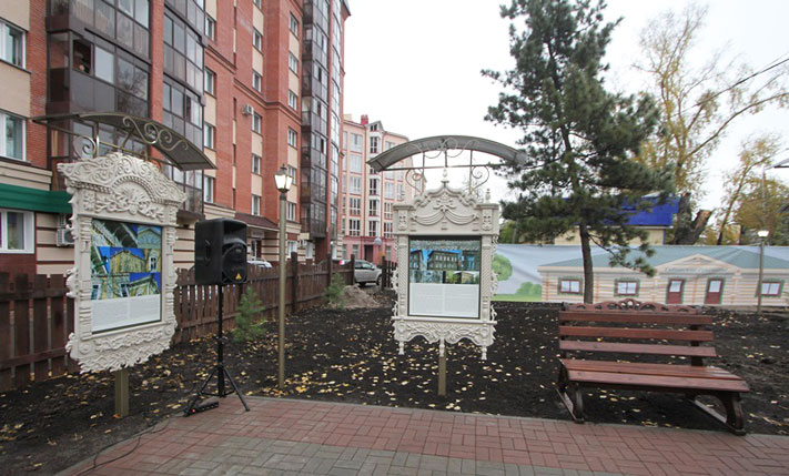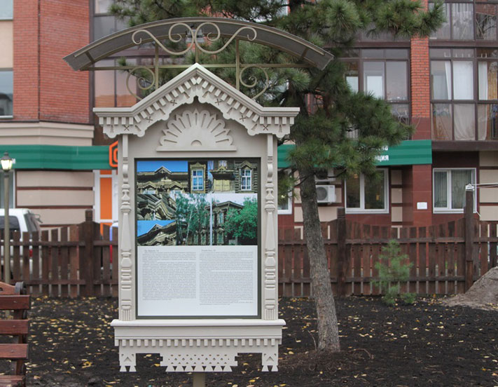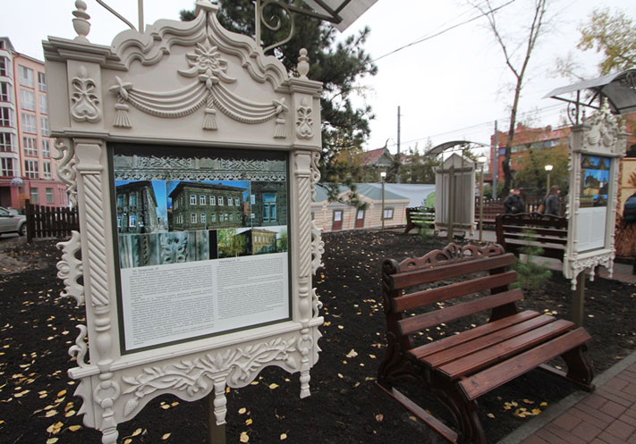 Резные деревянные наличники в сквере оформляют 8 стендов с фотографиями домов - объектов культурного наследия и главных достопримечательностей города. На каждом из стендов представлена информация на русском и английском языках об истории памятников деревянной архитектуры.