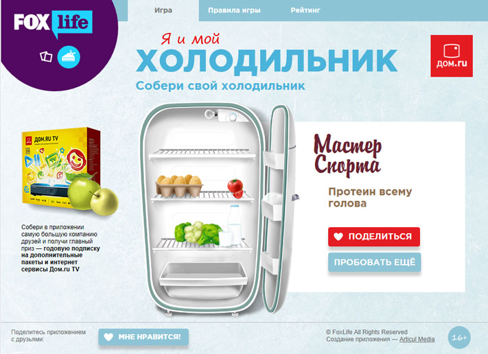 Телеком-оператор «Дом.ru» и развлекательный телеканал Fox Life дают старт совместной игровой акции. Абоненты «Дом.ru» могут испытать удачу, до 30 апреля сыграв в интерактивные игры «Внимание. Удача» и «Я и мой холодильник» в социальной сети «ВКонтакте» и выиграв ценные призы.