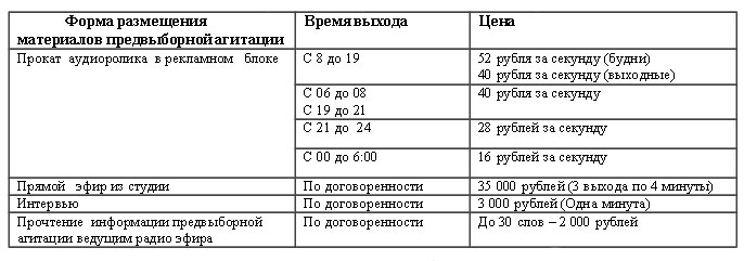 ООО “Радио Сибирь” оставляет за собой право не размещать агитационные материалы ненадлежащего качества, противоречащие действующему законодательству РФ или общей концепции построения радио-эфира.