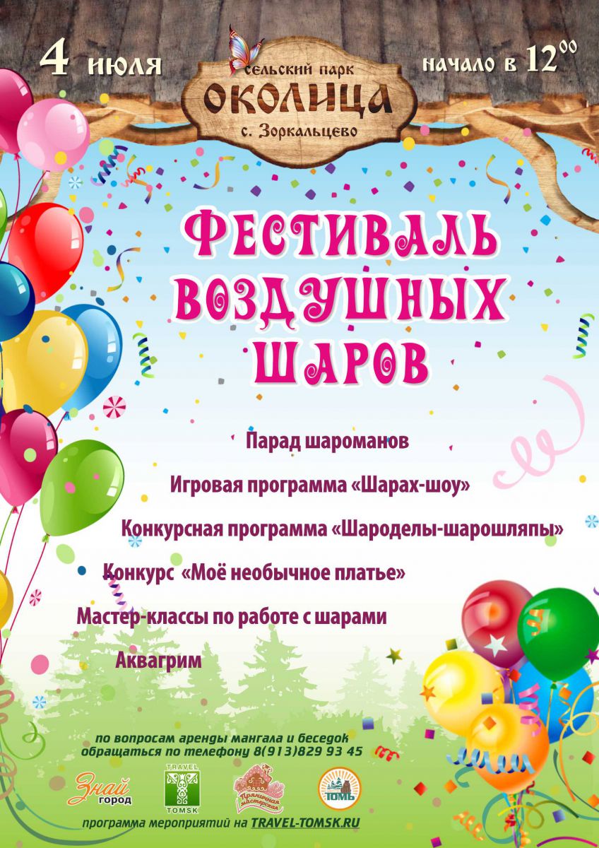 В субботу, 4 июля, в сельском парке "Околица" села Зоркальцево пройдет "Фестиваль воздушных шаров", на котором своими талантами поделятся томские аэродизайнеры - мастера декора воздушными шарами, сообщает туристский информационный центр Томской области.