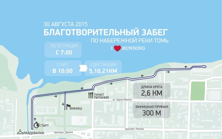 Забег стартует в 10.00 от Городского фонтана. Участники акции смогут выбрать одну из трех дистанций - 5,5, 10,7 или 21,1 километров. Маршрут дистанций представляет из себя круг протяжённостью 2,6 километра, который будет проходить вдоль набережной реки Томи от фонтана «Музыкальный» до речного порта и обратно.