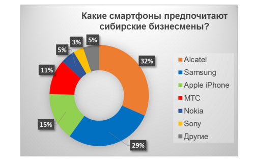 На втором месте, с небольшим отрывом от лидера в несколько пунктов (29 процентов), расположились смартфоны азиатского вендора Samsung. ТОП-3 самых популярных среди бизнес-клиентов гаджетов замыкают смартфоны американской корпорации Apple, доля которых вдвое меньше, чем у Samsung, и составляет 15 процентов. Среди других популярных гаджетов, которые выбирают сибиряки для выполнения бизнес-задач, бюджетные модели под брендом МТС (11 процентов), а также устройства Microsoft (5 процентов), Sony (3 процента) и гаджеты других вендоров.