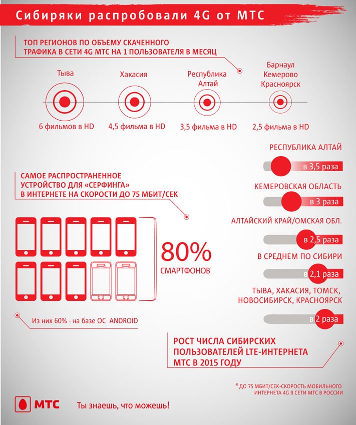 Самыми активными 4G-серферами стали жители Республики Тыва, где каждый пользователь сети МТС «четвертого поколения» в среднем ежемесячно скачивает объём информации, сравнимый с шестью фильмами в высоком разрешении*. На втором месте рейтинга Хакасия — здесь каждый пользователь 4G скачивает по 4,5 фильмов в месяц, замыкает тройку Республика Алтай — по 3,5 фильма. В среднем же пользователь 4G в Сибири скачивает объём данных сопоставимый с размером 2 фильмов в HD-качестве. А самым распространенным устройством для «серфинга» в интернете на скорости до 75 Мбит/с по статистике является смартфон, им пользуется 80 процентов всех пользователей сети LTE МТС в Сибири. 60% из них - используют для этого устройство на базе ОС Android.