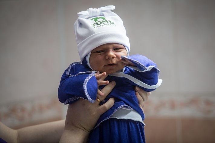 Сегодня, 9 марта, в день рождения «Томи» представители руководства команды и футболист-легенда подарили новорожденным томичам специально сшитые комплекты детской одежды с символикой томского клуба.