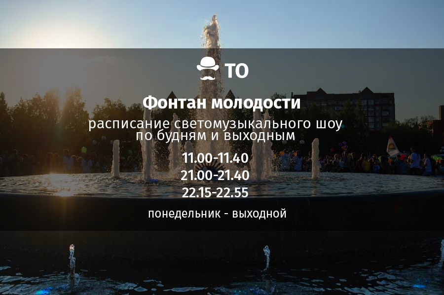 Светозвуковой «Фонтан Молодости» будет звучать трижды в день в будни и выходные (11.00-11.40, 21.00-21.40 и 22.15-22.55), кроме понедельника – день техобслуживания: