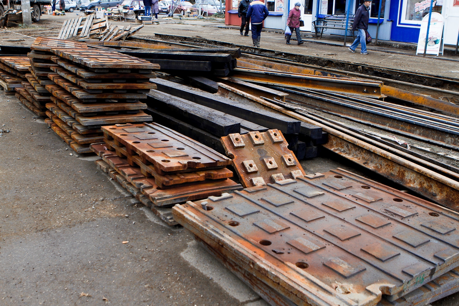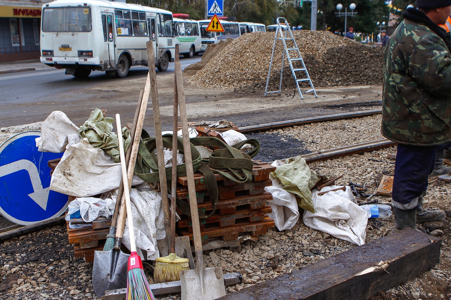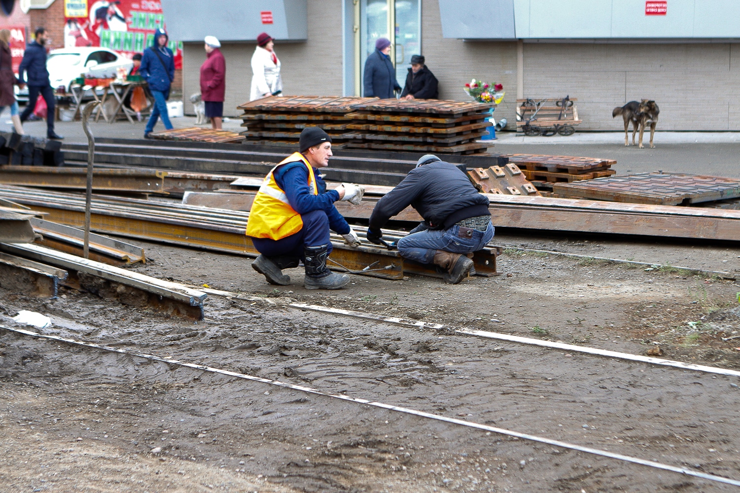 Здесь муниципальное «Трамвайно-троллейбусное управление» проводит капитальный ремонт верхнего строения трамвайного пути и обустраивает чугунные плиты покрытия.