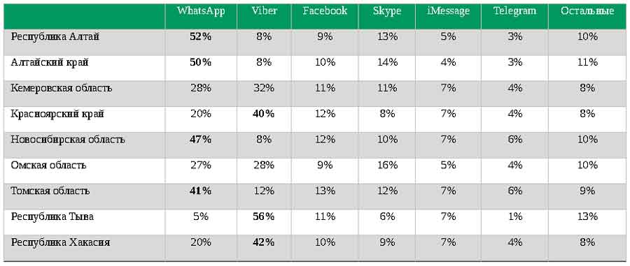 Более того, тесные географические связи с близлежащими областями разделили Сибирь фактически на две «цифровых» коалиции — регионы с доминированием WhatsApp (Новосибирск, Барнаул, Томск, Горно-Алтайск) и регионы, предпочитающие Viber (Красноярск, Абакан, Кызыл). Своеобразное «движение неприсоединения» сформировали Кемеровская и Омская области, где популярность WhatsApp и Viber по числу пользователей примерно одинакова (см. Таблицу 2).