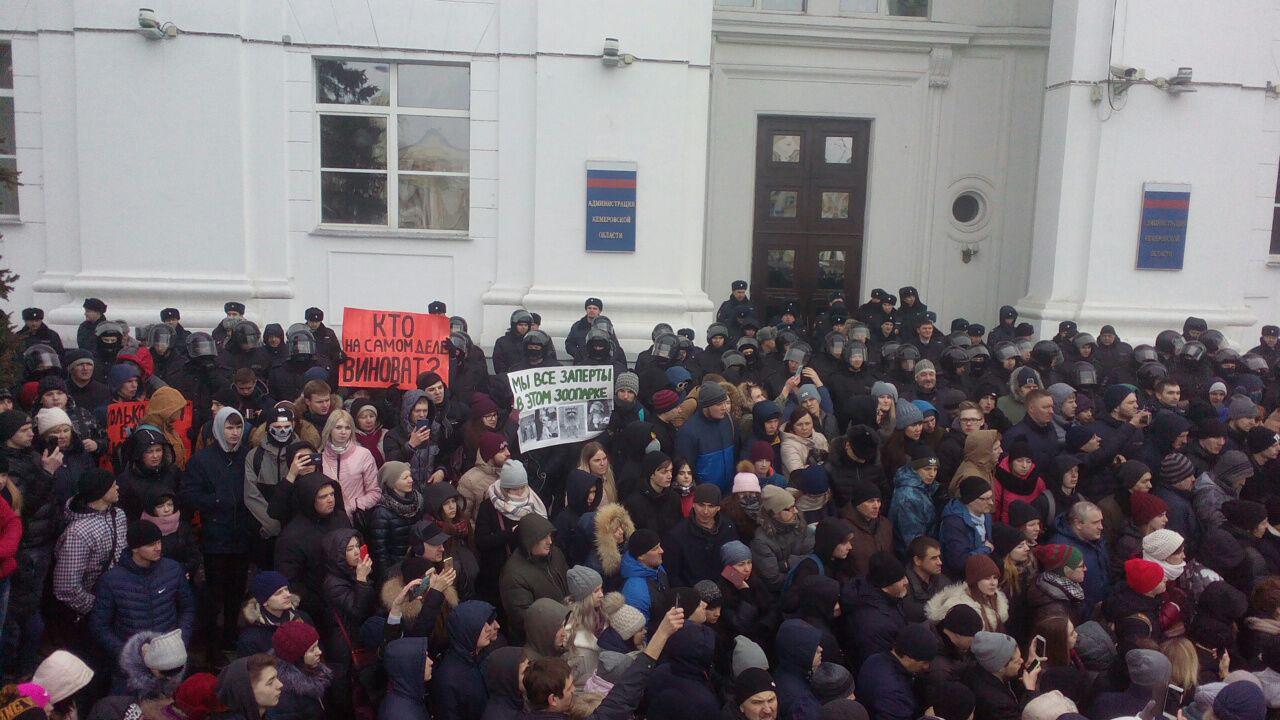 Жители Кемерова собрались у здания обладминистрации с призывами рассказать правду о пожаре в торговом центре, сообщает агентство «Интерфакс-Сибирь».