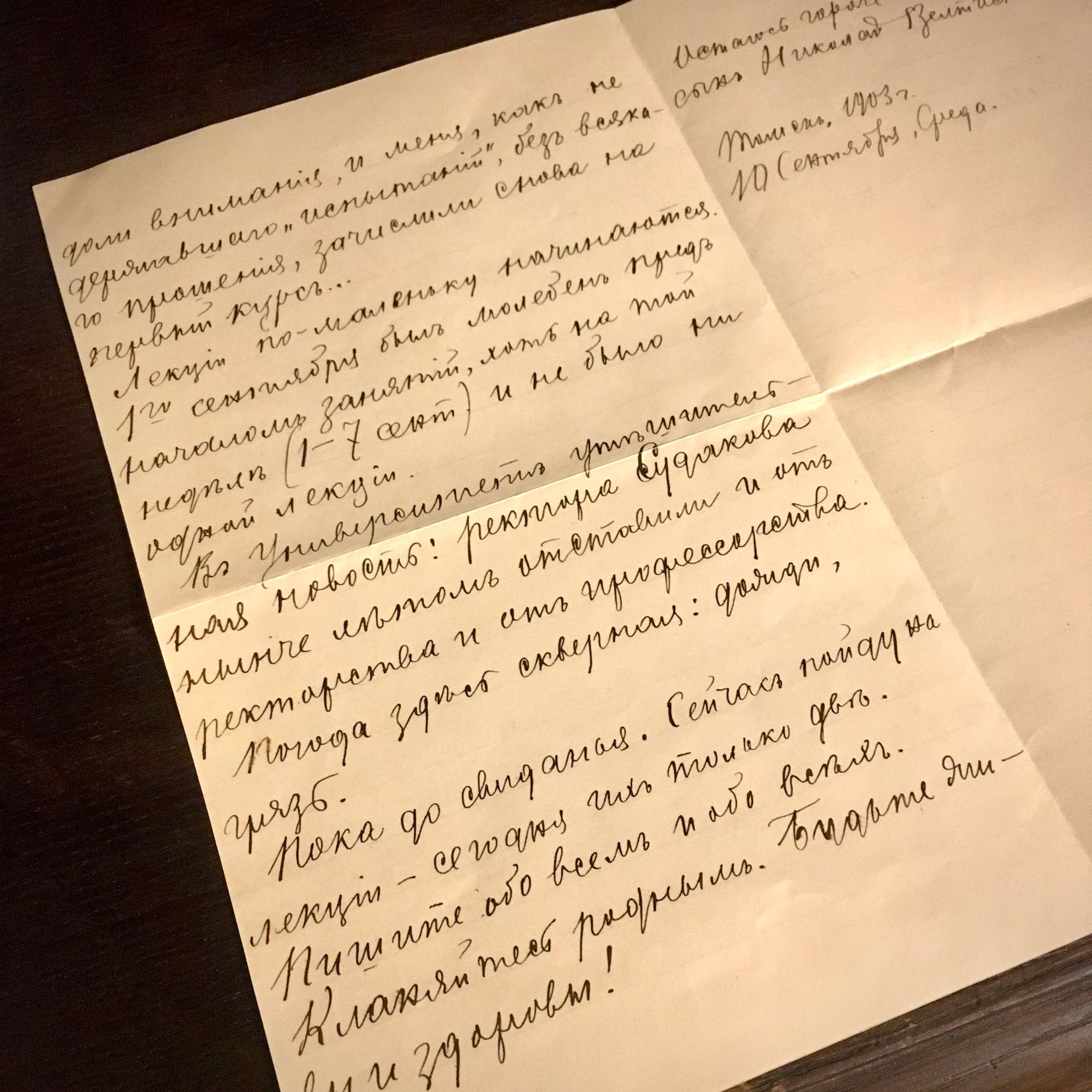 Коллекция частного музея «Профессорская квартира» пополнилась образцом эпистолярного жанра — письмом начала ХХ века. Написано оно было студентом Императорского Томского университета Николаем Велтистовым и адресовано его родителям.