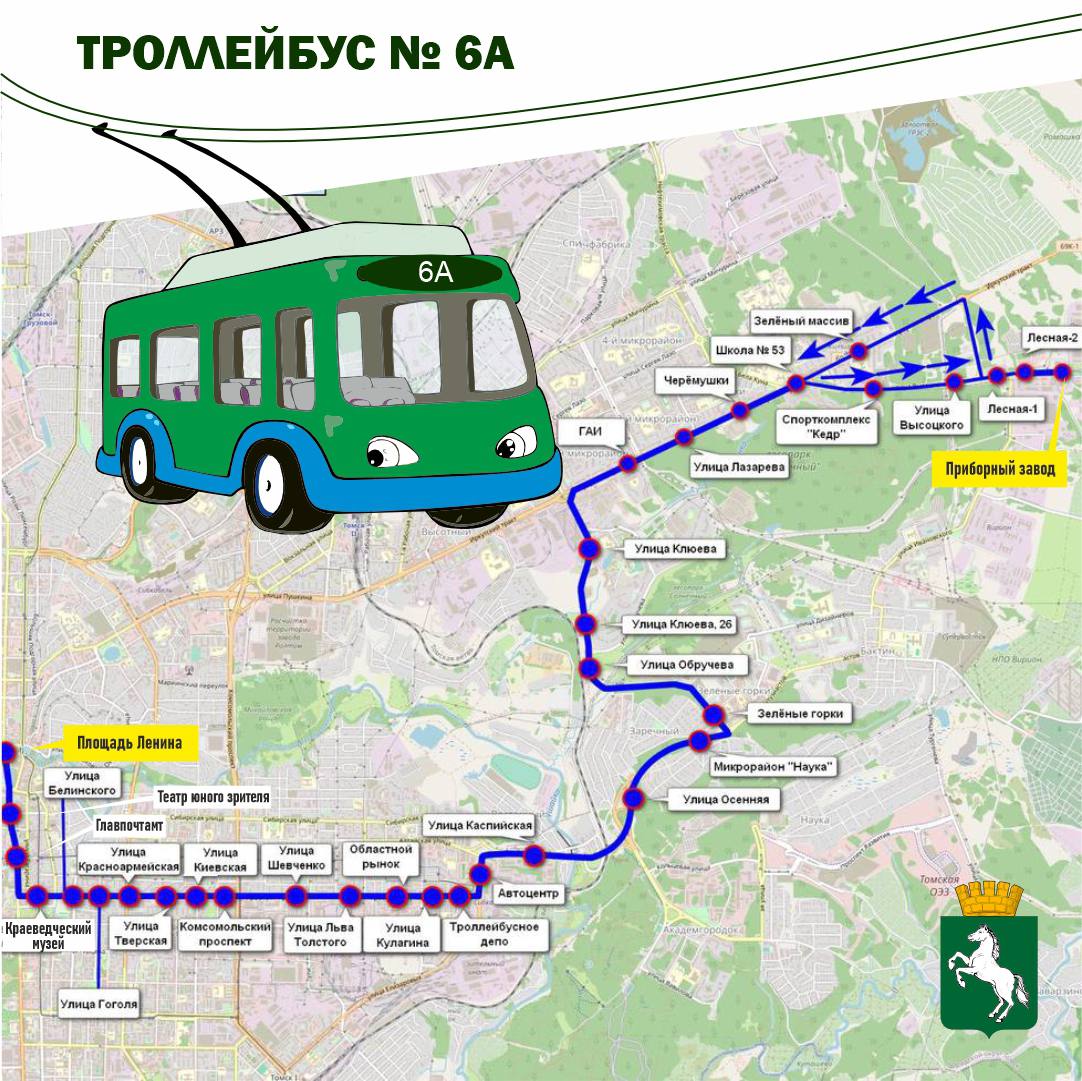 В прямом направлении троллейбусы 6А будут ездить по маршруту: Приборный завод, улица Лесная, «Зеленый массив», Школа №53, «Черёмушки», улица Лазарева, Областная ГИБДД, улица Клюева, улица Клюева, 26, улица Обручева, мкр. «Зеленые горки», мкр. «Наука», ул. Осенняя, ул. Каспийская, Автоцентр, Троллейбусное депо, ул. Кулагина, областной рынок, ул. Льва Толстого, ул. Шевченко, Комсомольский проспект, ул. Тверская, ул. Красноармейская, ул. Белинского, Краеведческий музей, Главпочтамт, Театр Юного Зрителя, площадь Ленина