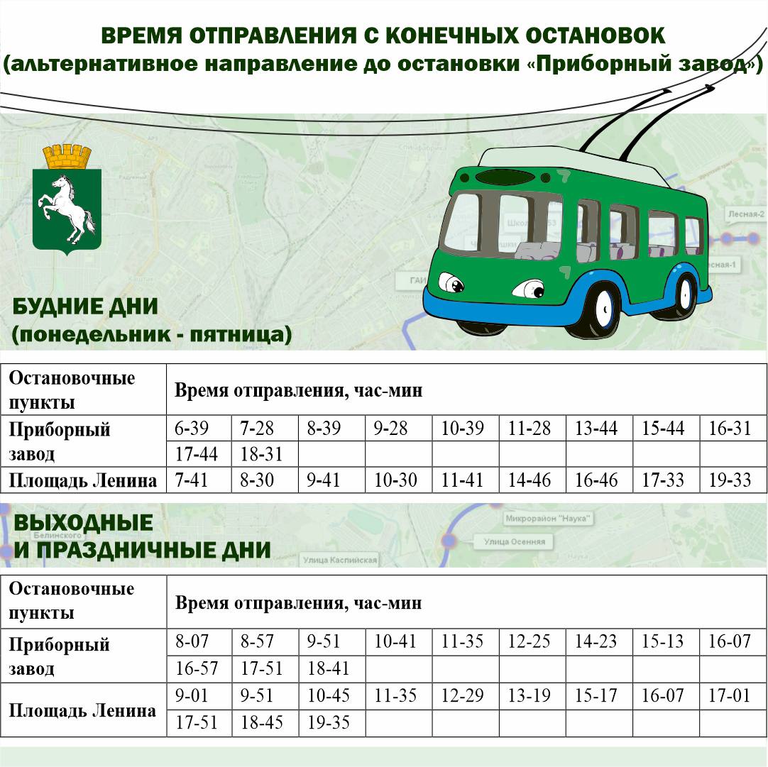 В будние дни троллейбусы начнут работу с остановки «Приборный завод» в 6.39, а закончат — в 18.31. С остановки «Площадь Ленина» первый троллейбус будут уезжать в 7.41, последний — отправится в 19.33.