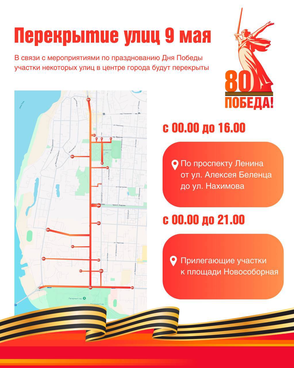 В пятницу, 9 мая, будет временно прекращено движение транспортных средств с 00.00 до 16.00 по пр. Ленина от ул. Алексея Беленца (без прекращения движения по ул. Алексея Беленца) до ул. Нахимова (без прекращения движения по ул. Нахимова с 00.00 минут 6.00).