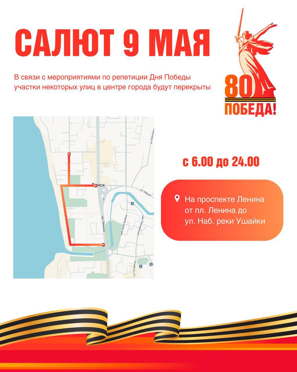 Так, сегодня, 7 мая, на время генеральной репетиции торжественных мероприятий с 19.00 до 23.30 будет ограничено движение транспорта на участке пр. Ленина от пр. Фрунзе до пр. Кирова, по пер. Спортивному от ул. Советская до пр. Ленина, по ул. Гагарина от пр. Фрунзе до пер. Спортивный, по ул. Московский тракт от пр. Ленина до пер. Типографский.