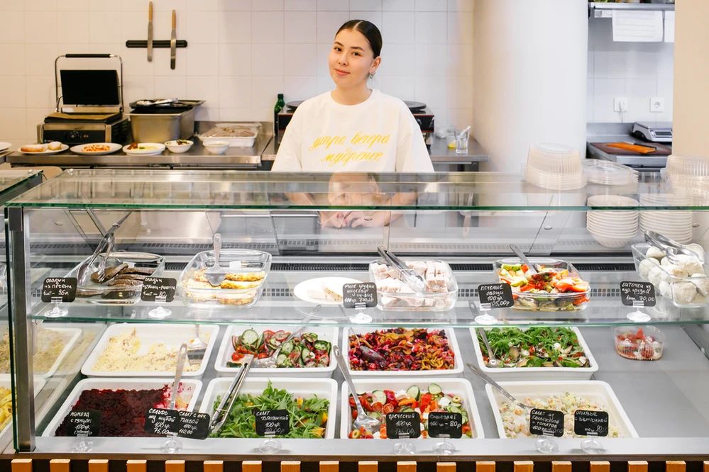 В заведении также подготовили витрину с фасованными блюдами и напитками, которые можно оплатить на кассе самообслуживания. Есть и зож-раздел с куриными биточками на пару, оладьями из цукини и рикотты и другими.
